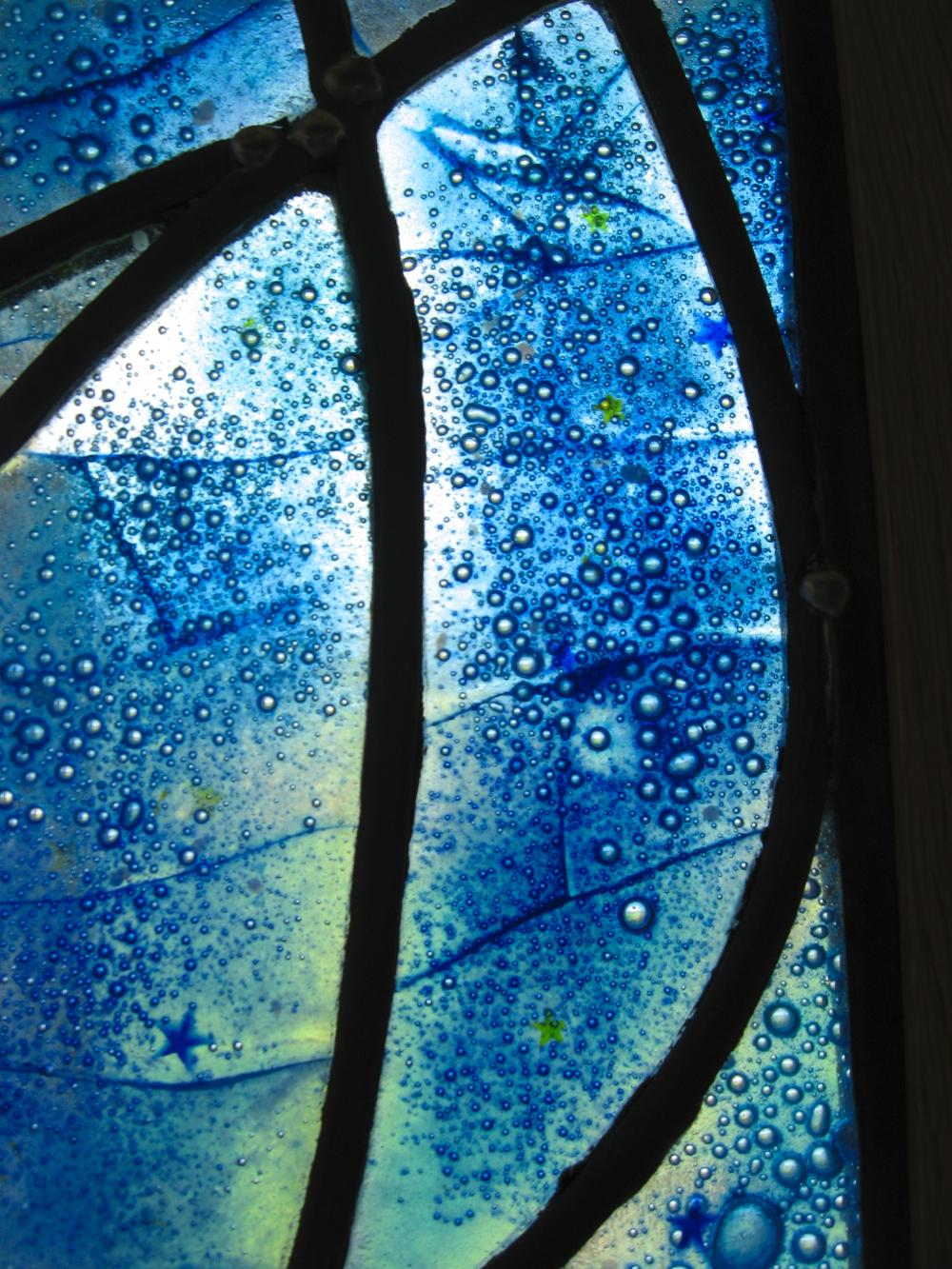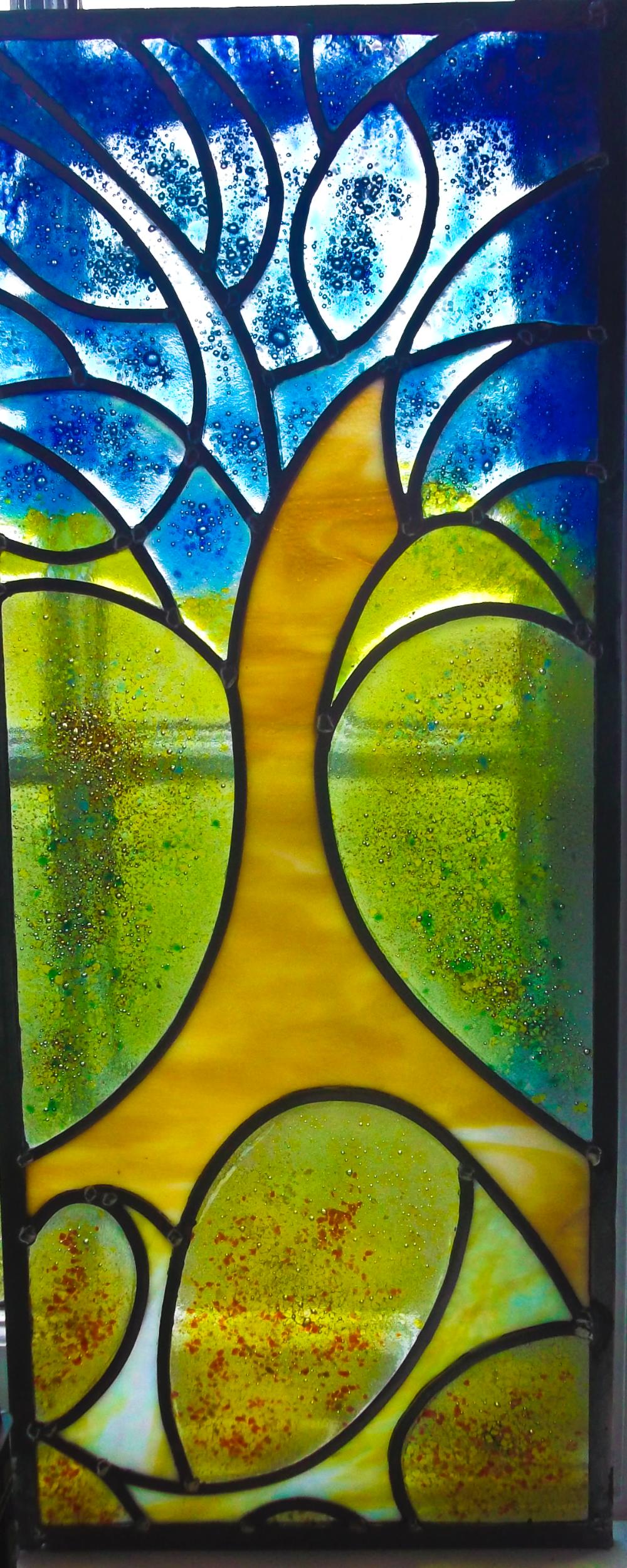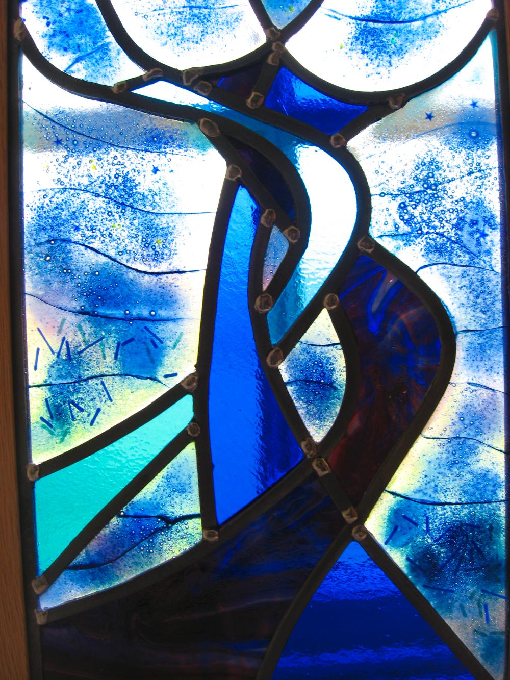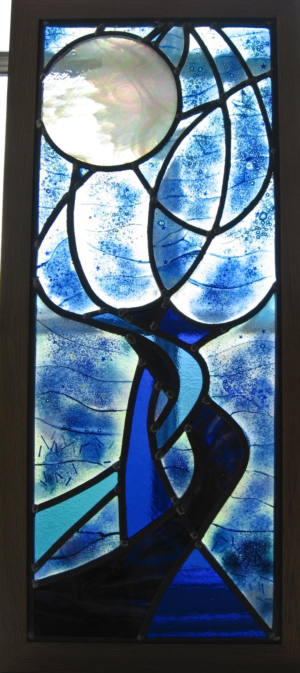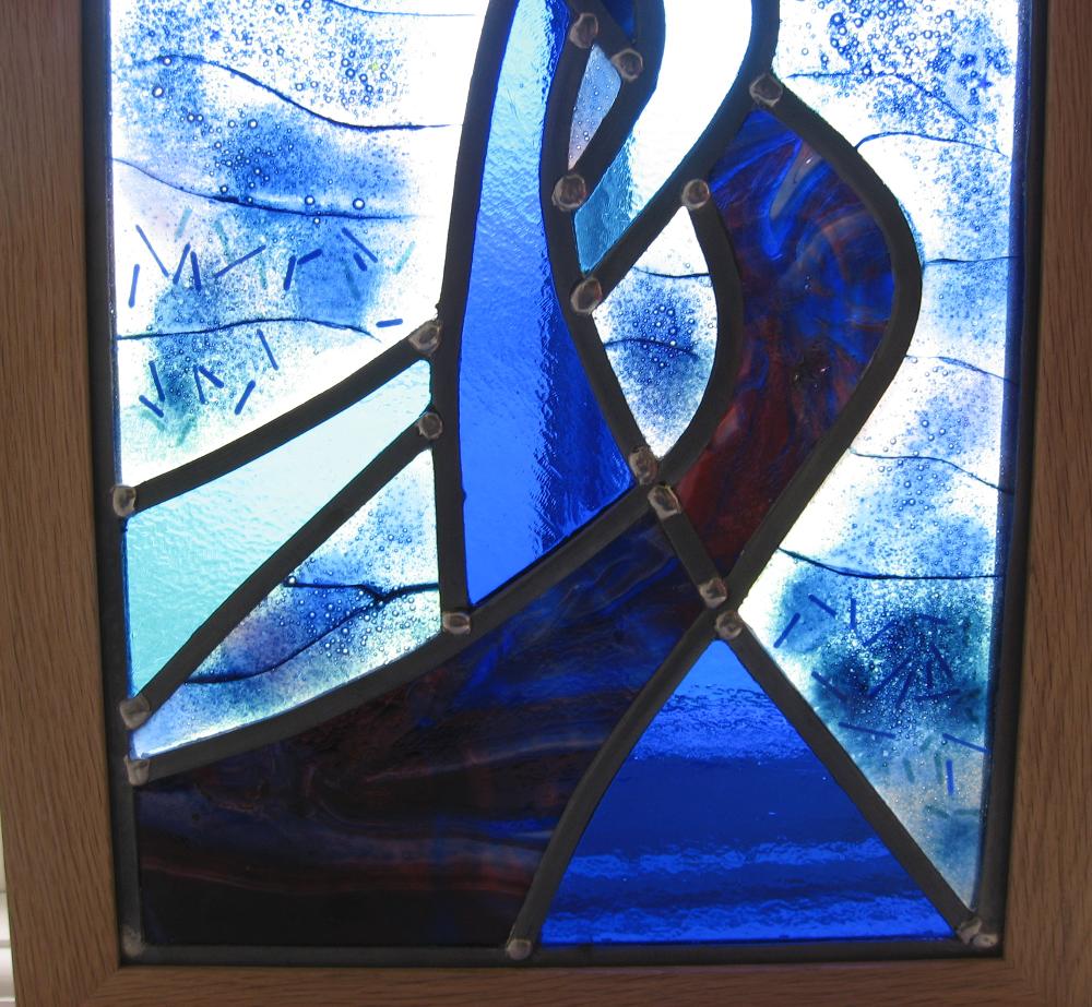 ''Cold ' ( as in stained glass) glass is fitted alongside pieces of 'warm' glass, each one individually handmade and fused together and fired in a kiln. Chemicals, enamels and glass powders give the colour, texture and luminosity for each section.